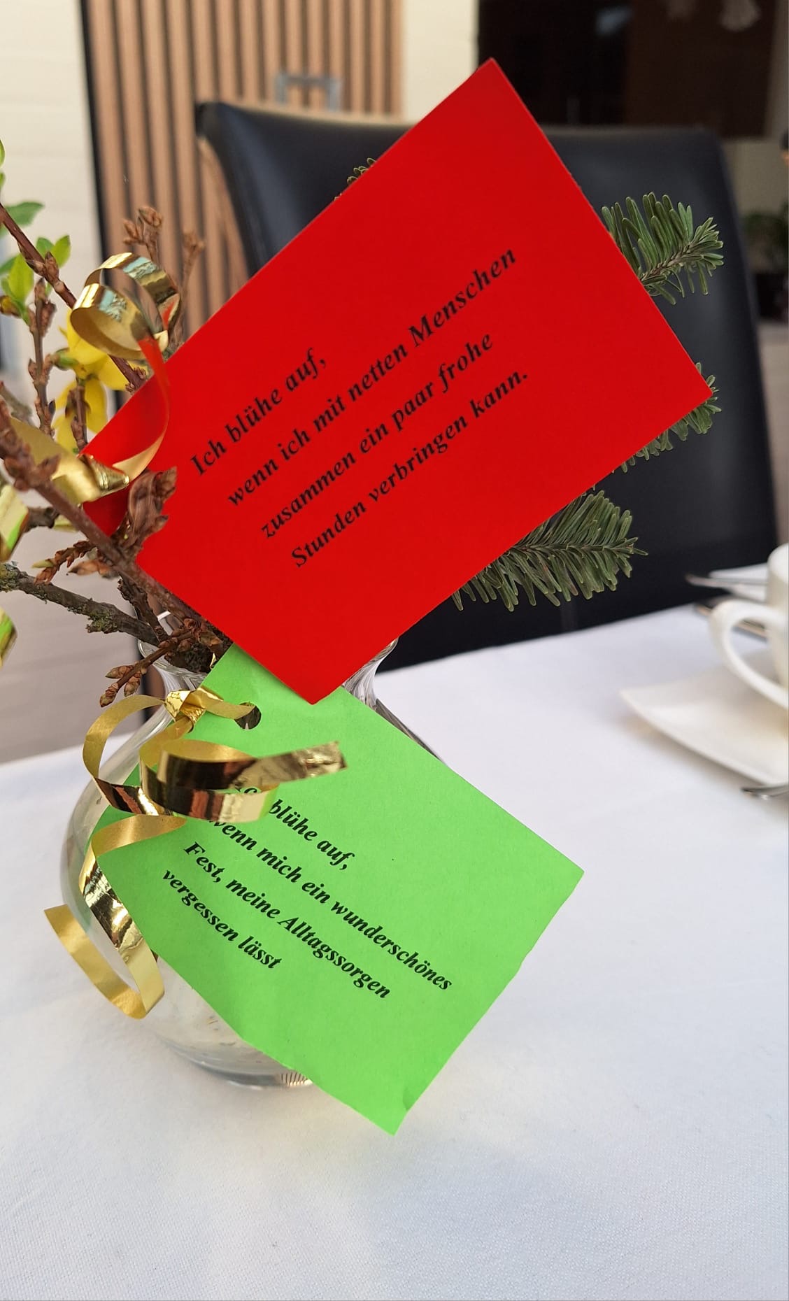 Mit Texten zur Einstimmung auf den Advent begann das Treffen. Da es auf den Namenstag der Hl. Barbara fiel, war bekamen alle Teilnehmenden einen Barbara-Zweig mit guten Wünschen daran, z. B.: „Ich blühe auf, wenn ich mit netten Menschen ein paar frohe Stunden verbringen kann“ oder „Ich blühe auf, wenn ich in schwierigen Situationen die Nähe und Hilfe Gottes deutlich spüre“.